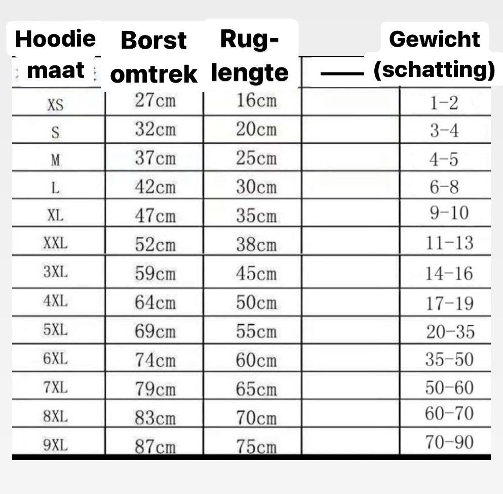Om je hond voor een hoodie te meten focus je allereerst op maat B, borstomtrek. De ruglengte, maat A, geeft een idee hoe lang de hoodie op de rug van de hond zal zijn, maar maat B primeert altijd. Bij twijfel tussen twee maten neem je best de grotere van de twee.
